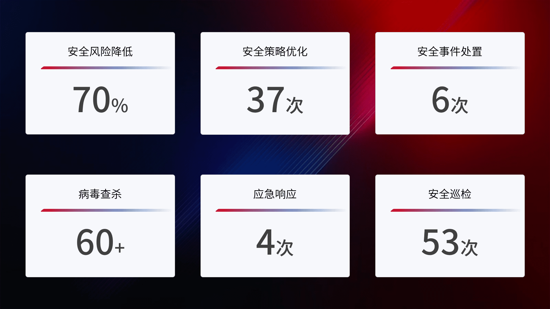 提供全面的安全事件报告体系,,,包括处置报告、、周报、、、季度和年度总结,,结合持续监控,,帮助客户深入了解网络安全状况。。。。